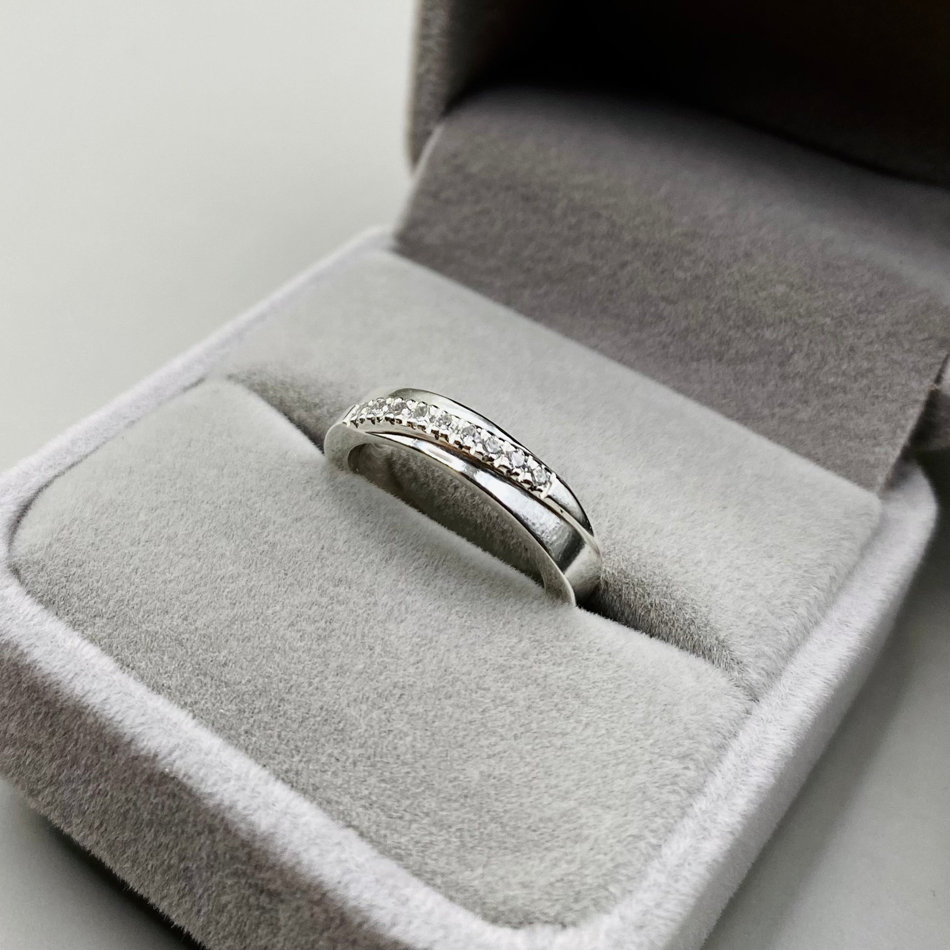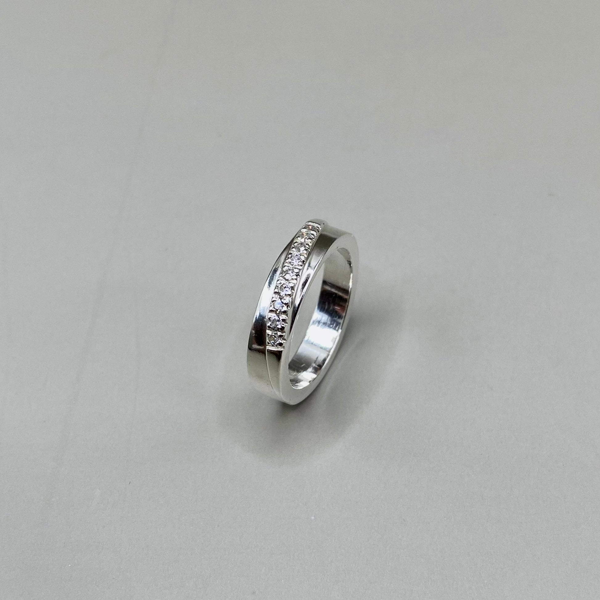 - Diseño: anillo de 9 piedras de aprox. 1.5 mm de diámetro (1.5 puntos, 13.5 puntos en total), engastadas en granos en diagonal en una banda más gruesa.