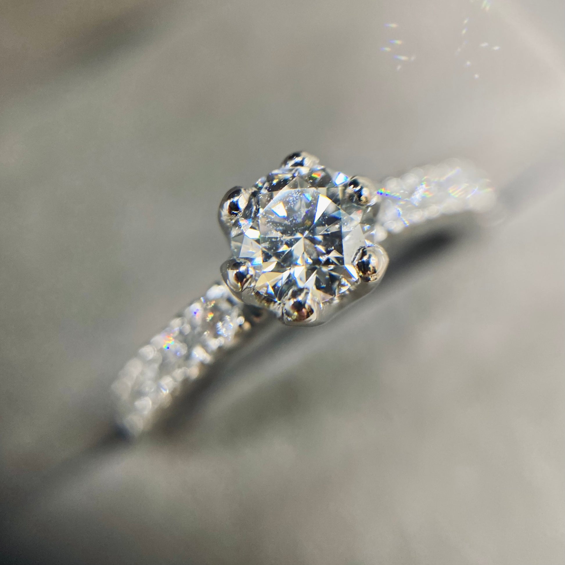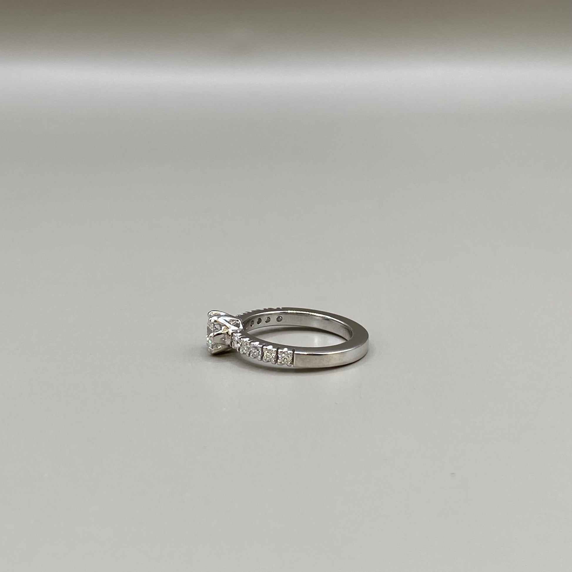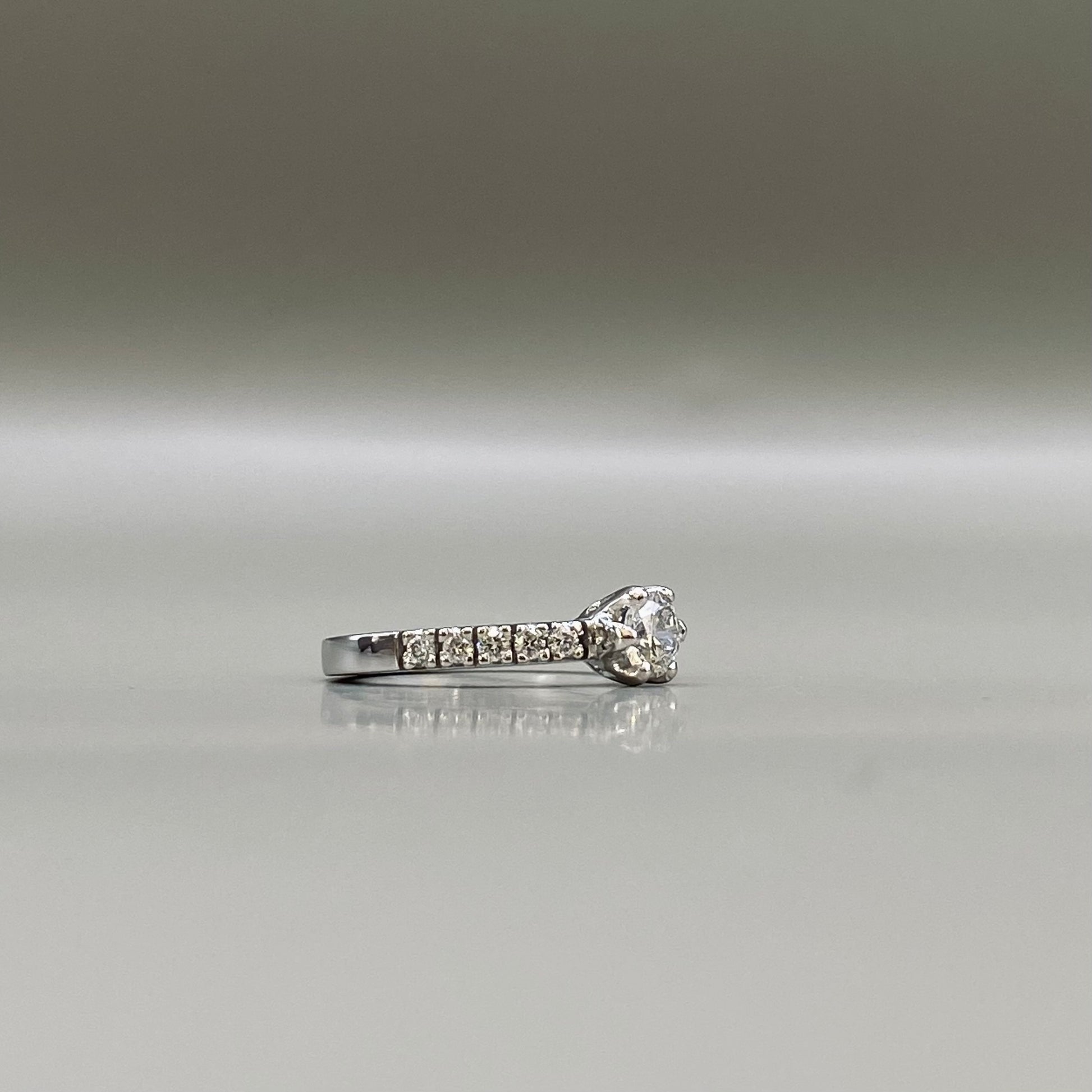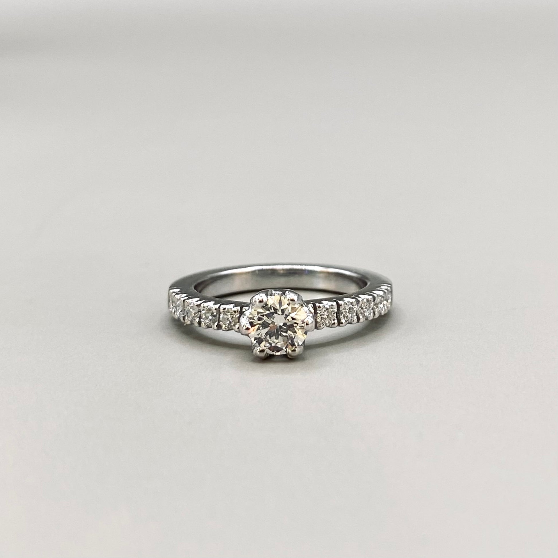 Diseño: anillo con piedra central de aprox. 5.0 mm de diámetro (50 puntos) engastada en canasto tallado a mano y 10 piedras laterales de aprox. 1.75 mm de diámetro (20 puntos en total), engastados en granos.