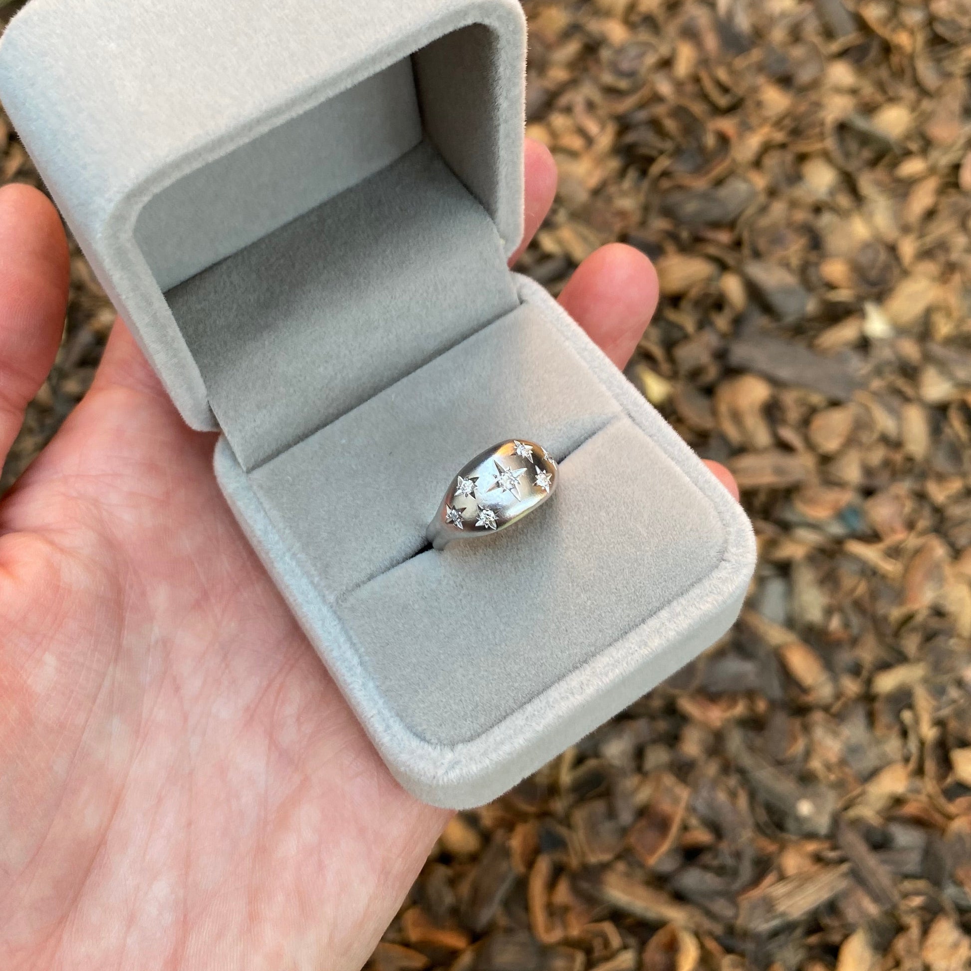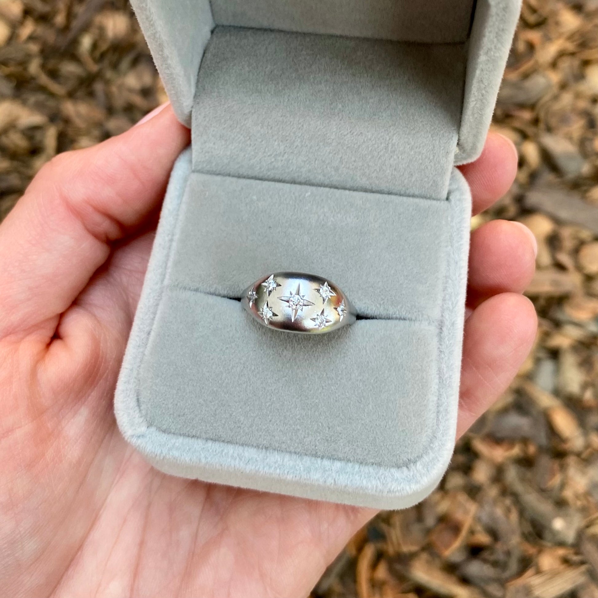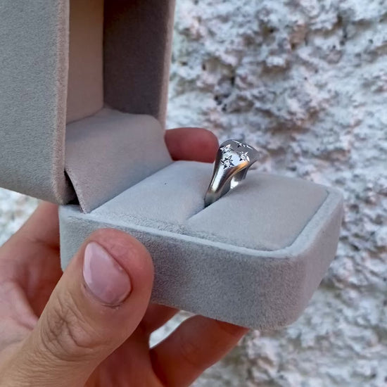 - Diseño: anillo con piedra central corte brillante de aprox. 1.9 mm de diámetro (3 puntos) y 6 piedras laterales de aprox. 1.5 mm de diámetro (1.5 puntos, 9 puntos en total) en engaste estrella.